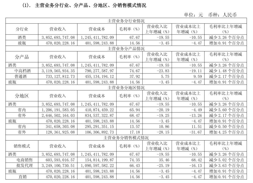 舍得酒业2025年中高等酒销售收入为31.20亿元,同比下落23.83%,毛利率同比减少1.48个百分点。
