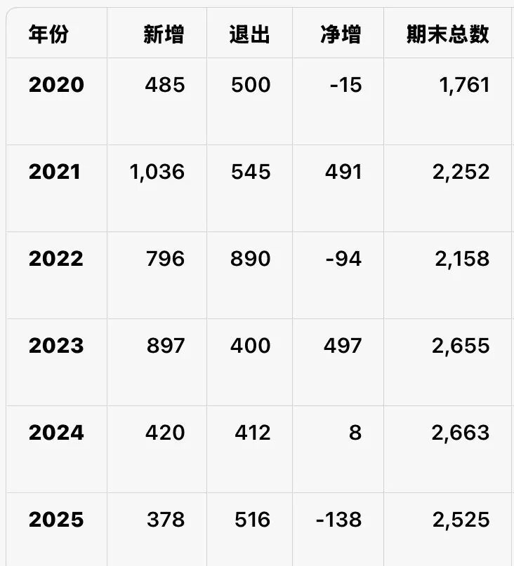 临了2025年底,舍得酒业共有经销商2525家,较2024年末的2663家,减少了138家。
