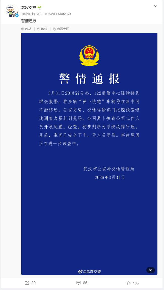 4月1日凌晨,武汉交警发布警情通报,说明萝卜快跑因系统发生故障,多辆车停留路面,最终乘客安全下车,无东谈主受伤。