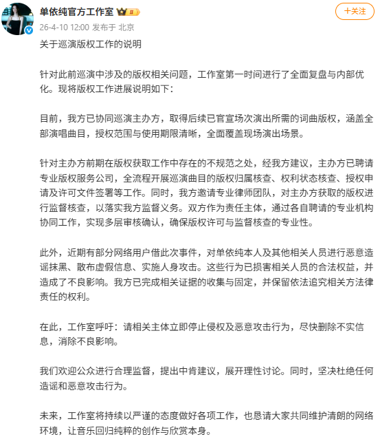 4月10日云开体育,@单依纯官方职责室 发布对于巡演版权职责的评释: