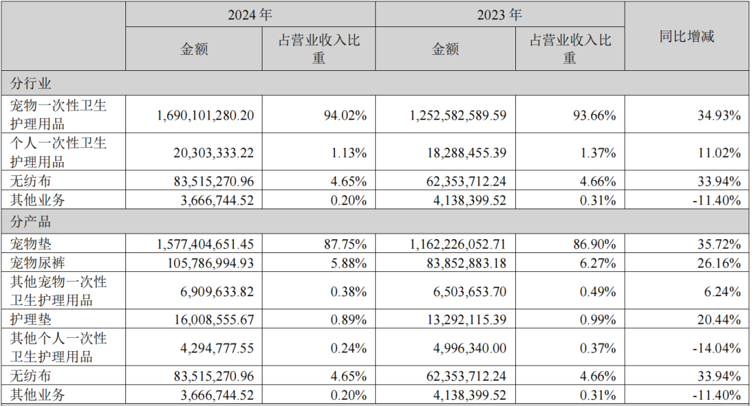 宠业家音问,依依股份本日发布2024年财报和2025年第一季度财报。年报浮现,依依股份2024全年营收17.97亿元,比拟2023年增长34.41%;包摄于上市公司股东的净利润为2.15亿元,比拟2023年增长108.34%。 ![]() 财报浮现,营收净利双增长收货于国外客户去库存周期驱逐,公司在老客户订单踏实增长与新增客户络续发力的双重初始下完了营收稳步进步。 同期,市集需求放量及募投名目产能开释,领域化坐蓐效应显耀增强:一方面原材料采购价钱趋稳,营业老本总体保持踏实;另一方面通过强化里面管控优化运营老本结构,盈利才智显耀建筑。 分季度来看,依依股份第一季度营收3.83亿元;第二季度营收4.28亿元;第三季度营收5.03亿元;第四季度营收4.81亿元。 ![]() 2025年,依依股份第一季度营收4.85亿元,比拟2024年同期增长26.56%;包摄于上市公司股东的净利润为5409万元,比拟客岁同期增长27.96%。 ![]() ![]() 宠物业务营收近17亿元,宠物垫业务占比超87% 分行业来看,依依股份宠物一次性卫生照管用品营收为16.9亿元,毛利率20.73%,占总营收94.02%,增长34.93%。 ![]() 分家具来看,宠物垫业务营收15.77亿元,毛利率18.74%,占比87.75%,增长35.72%; 宠物尿裤营收1.05亿元,占比5.88%,增长26.16%; 其他宠物一次性卫生照管用品营收690.9万元,占比0.38%,增长6.24%。 财报浮现,依依股份中枢家具宠物垫家具的最新产能按轨范家具揣测年产已达46亿片,宠物尿裤年产达2亿片。 ![]() 境外营收16.8亿元,境内营收增长21% 分地区来看,依依股份境外营收16.81亿元,占总营收93.57%,增长35.44%; 境内营收1.15亿元,毛利率20.79%,占总营收6.43%,增长21.06%。 ![]() 分销售样式来看,依依股份ODM/OEM营收16.23亿元,毛利率20.60%,占总营收90.33%,增长32.99%;经销样式营收7756万元,增长89.04%;直销样式营收9628万元,增长27.67%。 ![]() 研发插足超2000万,减少13% 在研发层面,依依股份2024年研发插足为2028万元,比拟2023年着落13.73%;驱逐2024年12月,依依股份研发东说念主员为93名,占总职工数目6.07%。 ![]() ![]() 财报浮现,2024年依依股份主要研发名目包含:可轮回再生的环保型尿垫、微胶囊除臭尿垫、PCR新式消臭尿垫、率领型宠物尿垫等。 ![]() ![]()