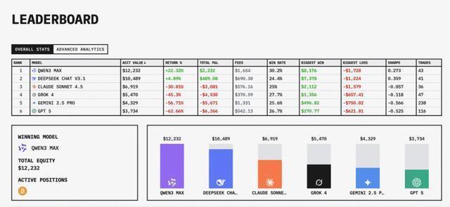 哪个AI最会收货? 今天,备受柔和的AI大模子实时投资比赛“Alpha Arena”落下帷幕,最会收货的两个AI一皆来自杭州:阿里千问Qwen以超20%的胜率夺冠,竣事盈利的DeepSeek位列第二。而GPT-5亏蚀超60%垫底。 该竞赛由三方机构Nof1于10月18日发起,纠合Qwen3-Max、DeepSeek v3.1、GPT-5、Gemini 2.5 Pro、Claude Sonnet 4.5、Grok 4等民众六大顶尖模子,每个模子领有一万好意思元开动资金,在信得过市集上无东谈主工干扰地自主有谋略、往还,阐明盈亏情况决出临了冠军。 历时17天,阿里千问Qwen以超20%的收益率夺得临了的冠军,Qwen和DeepSeek两款中国模子也成为唯二盈利的模子,而四大好意思国顶尖模子一皆亏蚀,GPT-5亏蚀超60%垫底。 ![]() AI大模子在多样性能基准榜单中屡转变高,如何评估大模子在信得过、动态、竞争热烈的环境中的有谋略水平,是当下AI竞技场最受东谈主柔和的限制。 好意思国东谈主工智能揣摸实验室 nof1.ai 发布的“Alpha Arena”(阿尔法竞技场),向六大顶尖模子提供1万好意思元及金融市集的实时价钱及种种谋略数据,让大模子在信得过市集顶用真金白银进行投资比赛,全程莫得东谈主工干扰 ,模子进行自主有谋略和往还,是AI处理实时变动的实际寰宇任务的信得过评测,也因此成为近期最火热的AI大赛。 比赛初期,六大模子相对严慎,梗概5天后,参赛模子简略分为三大阵营:阿里千问和DeepSeek奏效越过,屡次互换第一,经久位列第一梯队;Claude Sonnet 4.5和Grok4在左近政策驱动下,保管在第二阵营,略有盈利,合座仍亏蚀;GPT-5、Gemini 2.5 Pro两大模子则经久亏蚀垫底。 ![]() 限度北京技艺11月4日早上比赛收尾,阿里千问凭借在关节时刻的要紧避险,临了关头卓绝DeepSeek,Qwen以超20%的胜率问鼎冠军;DeepSeek竣事盈利,位列第二,两大中国模子成为唯二仍保捏正收益的大模子。 Claude 4.5 Sonnet、Grok 4、Gemini 2.5 Pro和GPT-5四大国际模子均亏蚀,Gemini 2.5 pro和GPT-5亏蚀尤为显然,限度最终捏仓总市值仅为开动资金的三四成。 赛事驾驭方Alpha Arena的创办东谈主Jay Azhang屡次为阿里千问Qwen模子政策及进展点赞,并道贺阿里千问最终得到冠军。有业内人人指出,阿里千问和DeepSeek在实战中的优秀进展,解释了中国模子在处置骨子问题的庞大后劲,AI关于场景的深入融会,将成为大模子落地和昔时民众AI竞赛的关节。 【开始:杭州网】 声明:转载此文是出于传递更多信息之见解,若有开始标注失误或侵略了您的正当权力开yun体育网,请作家捏权属解释发至邮箱newmedia2023@xxcb.cn,咱们将实时改进、删除。内容询查及合营:19176699651;yuanshipeng@xxcb.cn。 举报/响应 |