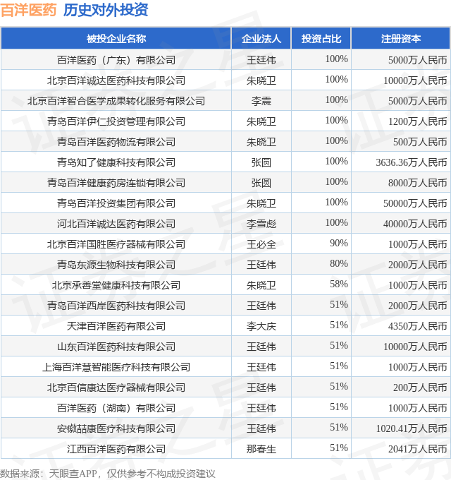 本站音问,把柄天眼查APP泄漏,百洋医药(301015.SZ)新增沿途对外投资事件,被投资公司为百洋医药(广东)有限公司,法定代表东说念主王廷伟,投资占比为100%。该公司从事医药制造业,注册成本为5000万东说念主民币。现在,百洋医药共存在对外投资28项,投资占比前20的技俩见下表: